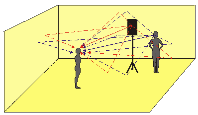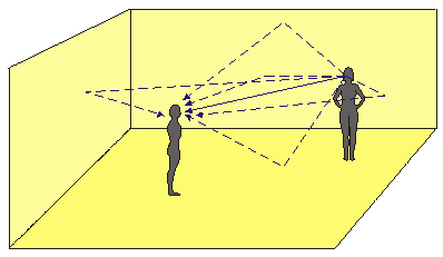 Consider two people in an ‘average’ room, one speaking and one listening (shown in fig. 2). The direct sound from the person will arrive first (solid blue line) a small number of milliseconds later a reflection will arrive from (in this case) the ceiling (reflections are shown as dotted lines). Next will come a reflection from the floor, then the nearest wall then the next wall and so on. Each reflection will go on to reflect of the next surface and diminish in intensity as it does so. The reflections of reflections start to move us into the field of reverberation which does not concern us here. All of these reflections are integrated by our auditory system into one coherent speech pattern provided that the reflections fit into the green or yellow areas in the diagram above. One important issue is the first arrival, this is the key which the auditory system uses to fix the location of the sound in space. Where you hear the first sound coming from is where you perceive the sound source to be. Very dry and small spaces will have reflections damped and/or with short times which will lie in the green region. More realistic spaces will fit into the upper green or yellow areas giving a feel a spaciousness to the listening environment, although it may be harder to precisely pin point the sound source without visual clues.
